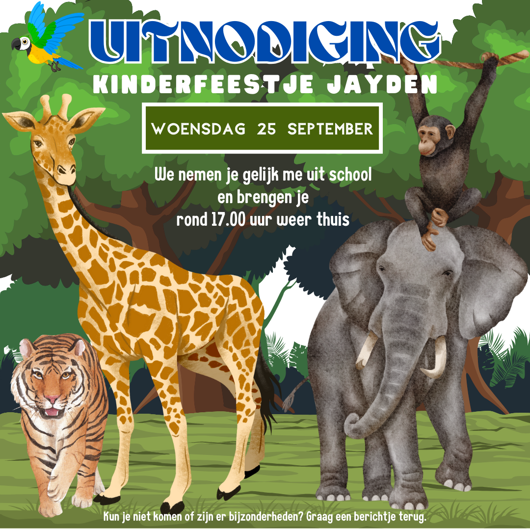 Het is feest in de jungle! Een te gekke uitnodiging om te versturen naar alle kleine aapjes en tijgertjes die je wilt uitnodigen voor het verjaardagsfeestje van je kind. Snel versturen naar alle vriendjes en vriendinnetjes, zodat hun ouders de feestdatum kunnen omcirkelen in hun agenda's.