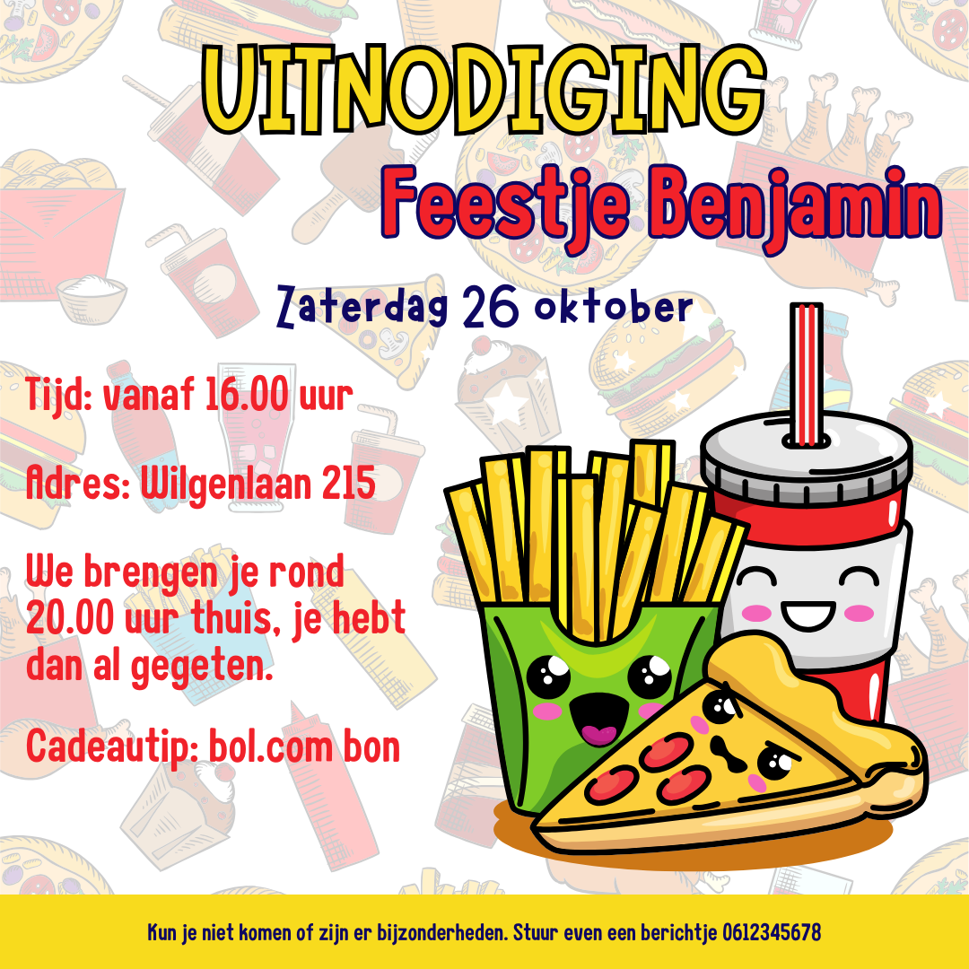 Met je feestbeesten lekker smikkelen bij de vetste fastfoodtent in de buurt? Of duiken je ouders de keuken in voor goudbruine frietjes op jouw party? Deze uitnodiging is zeker weten om te smullen! Stuur hem meteen door naar de ouders van je maatjes. Zo claimen ze die knalfeest-datum in hun agenda!