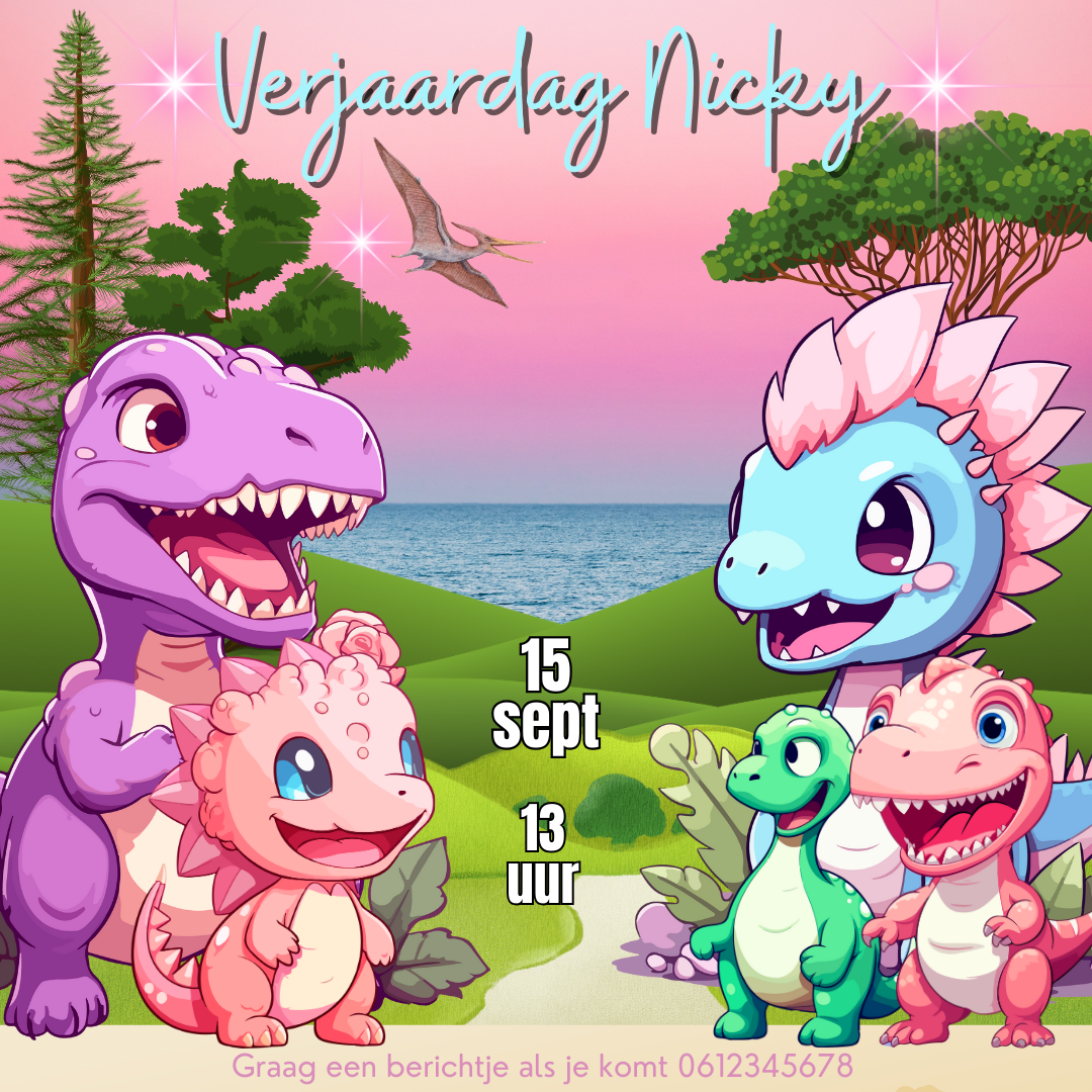 Tijd voor een feestje! Deze dolle Dino's staan te trappelen om het verjaardagsfeestje van jouw kind aan te kondigen. Snel versturen naar familie en vrienden, zodat zij deze speciale dag met stip kunnen noteren in hun agenda's.