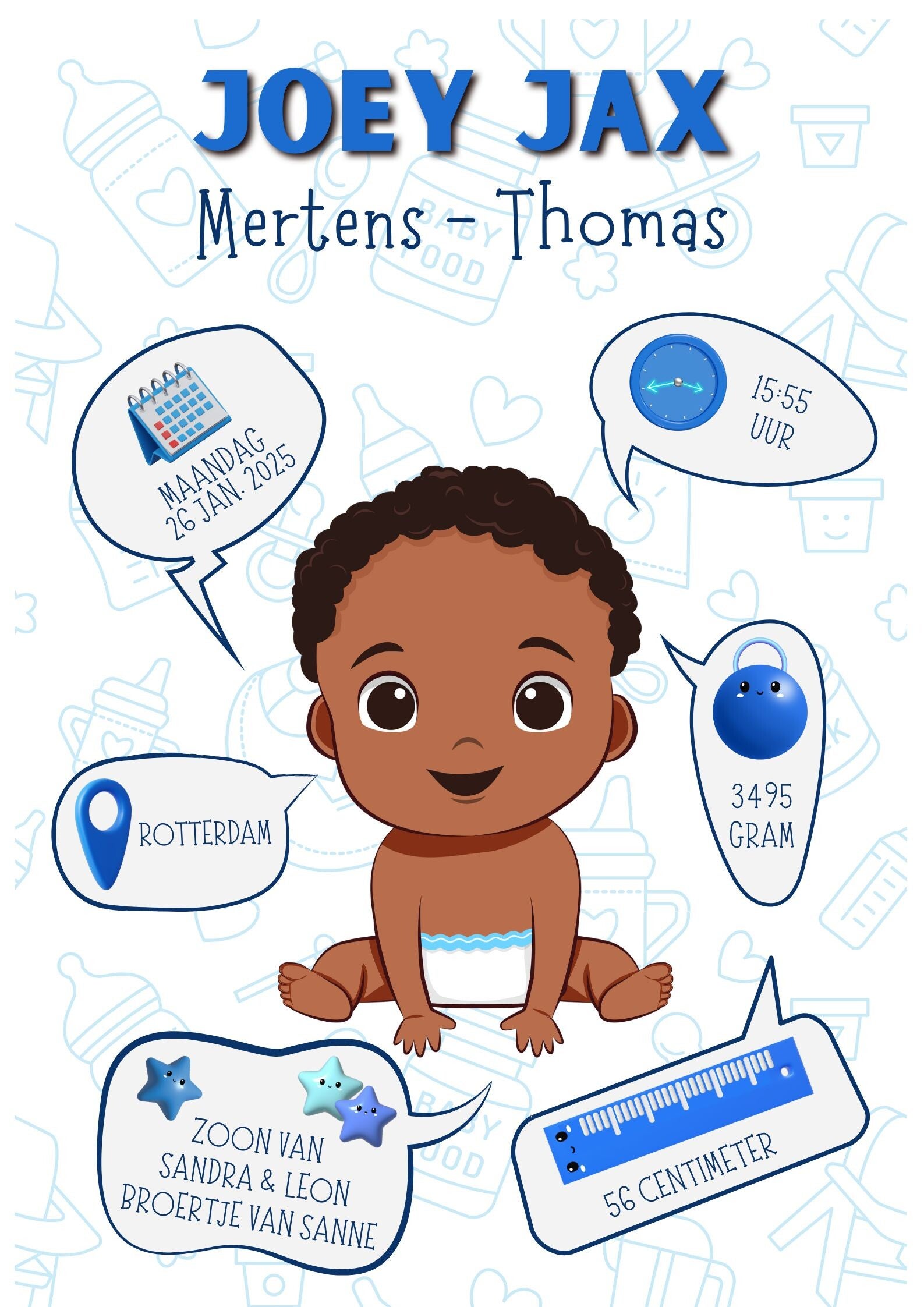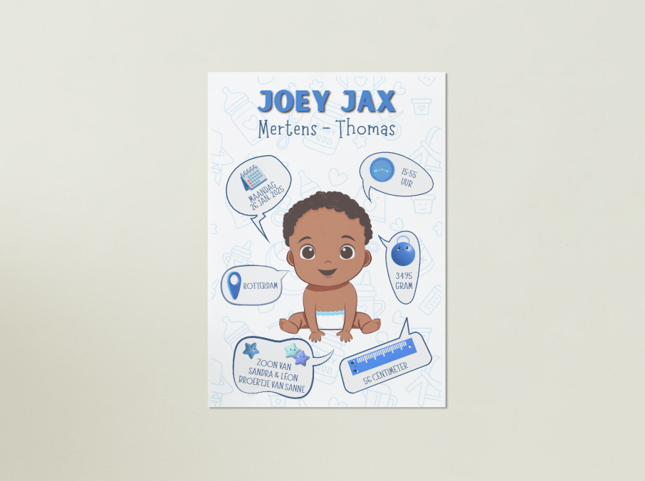Opzoek naar een origineel kraamcadeau? Denk dan eens aan deze geboorteposter. Voorzien van alle hoogtepunten van de geboorte. Super leuk om op te hangen in het slaapkamertje van de kleine spruit.