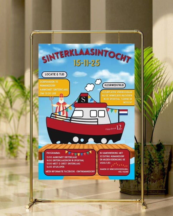 Perfect voor winkels, scholen, verenigingen of bedrijven die hun Sinterklaasintocht, koopavond of feest willen aankondigen.
